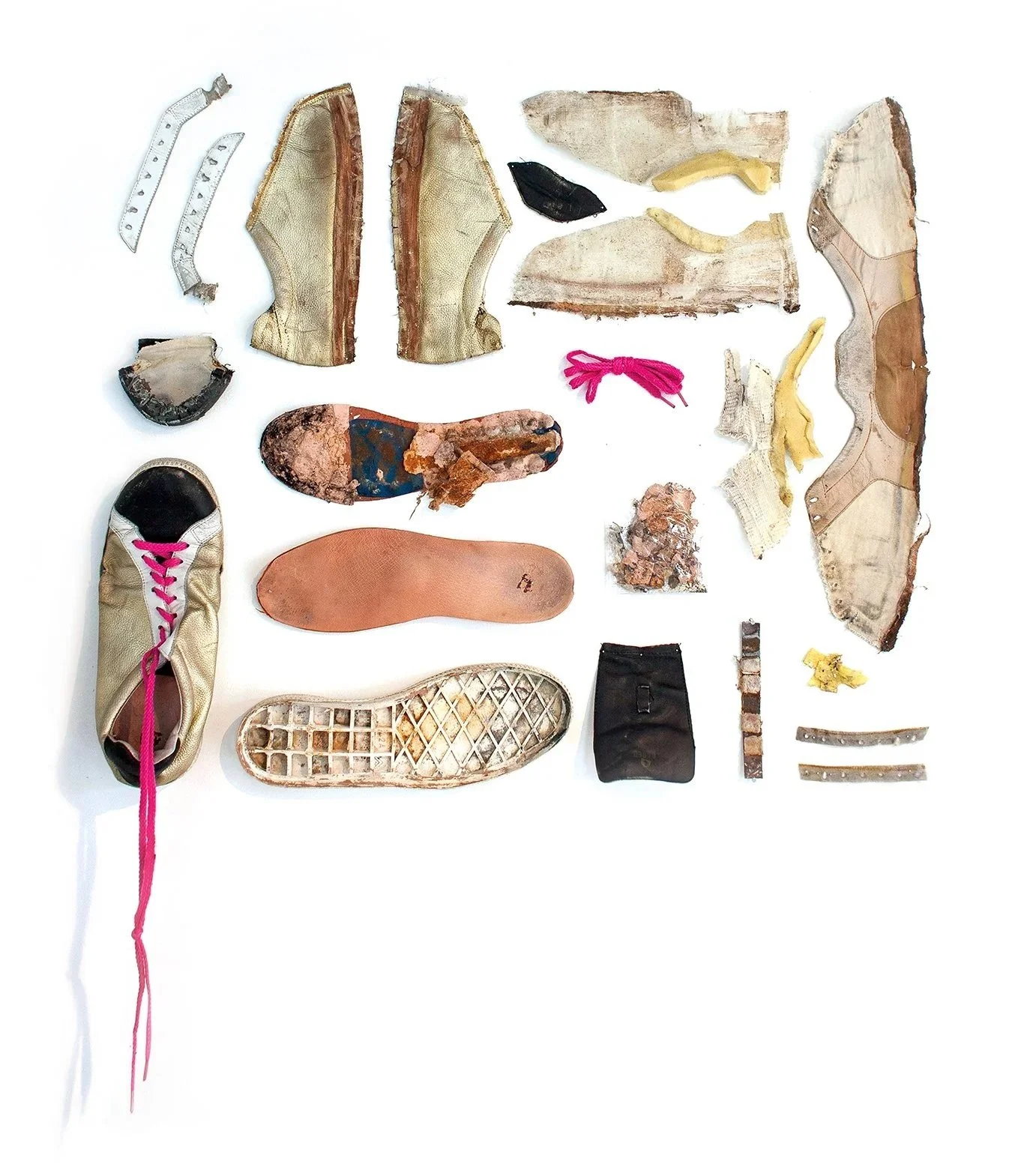 These shoes were made by Bared and purchased in 2018 by Annalise, a Brunswick resident and primary school teacher who responded to my request for old shoes that were beyond repair via the Merribek Hard Rubbish Rescue Facebook group. My teaching and research collaborator, Pennie Jagiello, and I designed an activity for Fashion Design Students at RMIT University to encourage material literacy, creativity, innovation, and circular design principles by deconstructing old shoes and reconstructing them into body-worn artefacts and accessories. Annalise’s shoes weren't used by the students. I'm unsure if I subconsciously held them back because I loved them so much, or they just weren't chosen, perhaps due to how degraded and dirty they were.