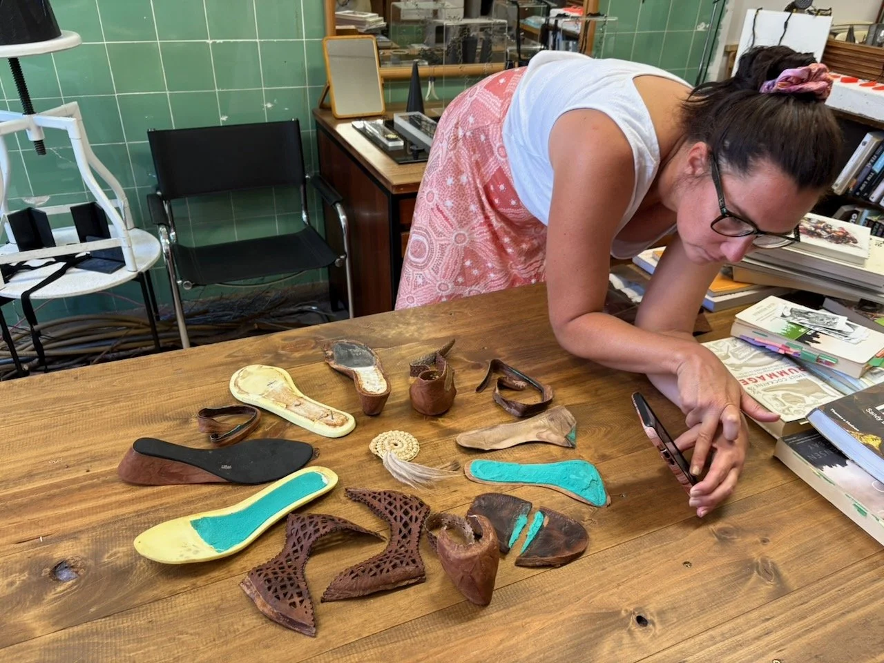 Emma, photographing a flat lay of her shoes in a circle formation. Image: Alex Sherlock, 2026